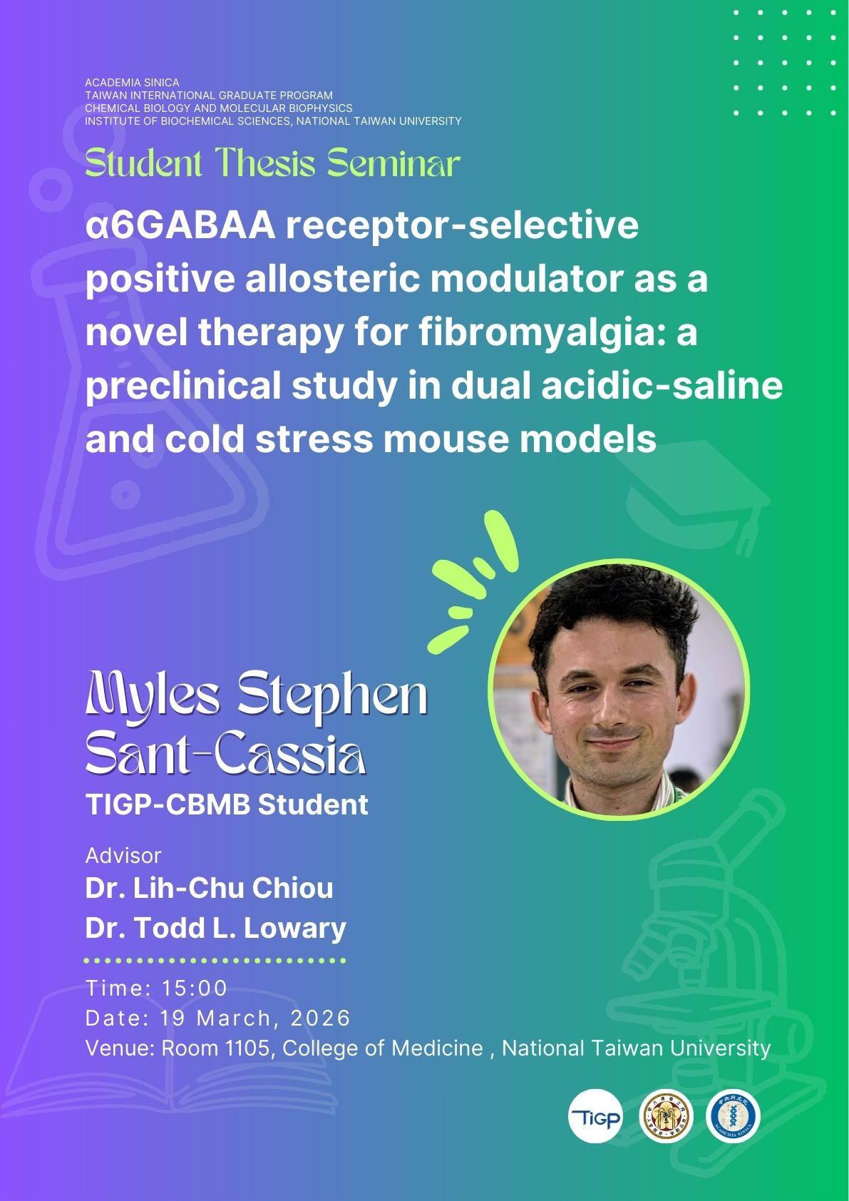 Student Thesis Seminar: Myles Stephen Sant-Cassia (α6GABAA receptor-selective positive allosteric modulator as a novel therapy for fibromyalgia: a preclinical study in dual acidic-saline and cold stress mouse models)