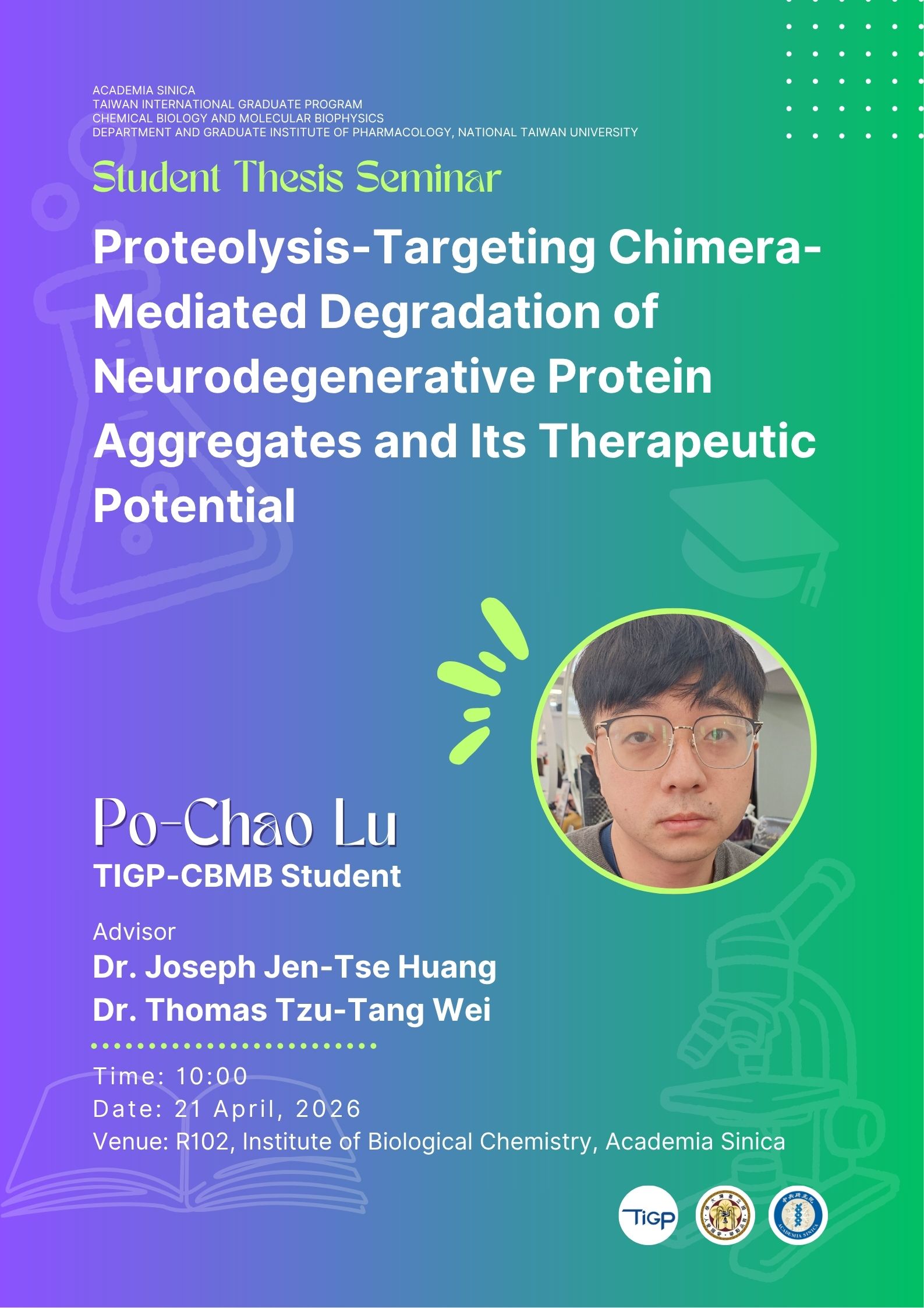 Student Thesis Seminar: Po-Chao Lu (Proteolysis-Targeting Chimera-Mediated Degradation of Neurodegenerative Protein Aggregates and Its Therapeutic Potential)